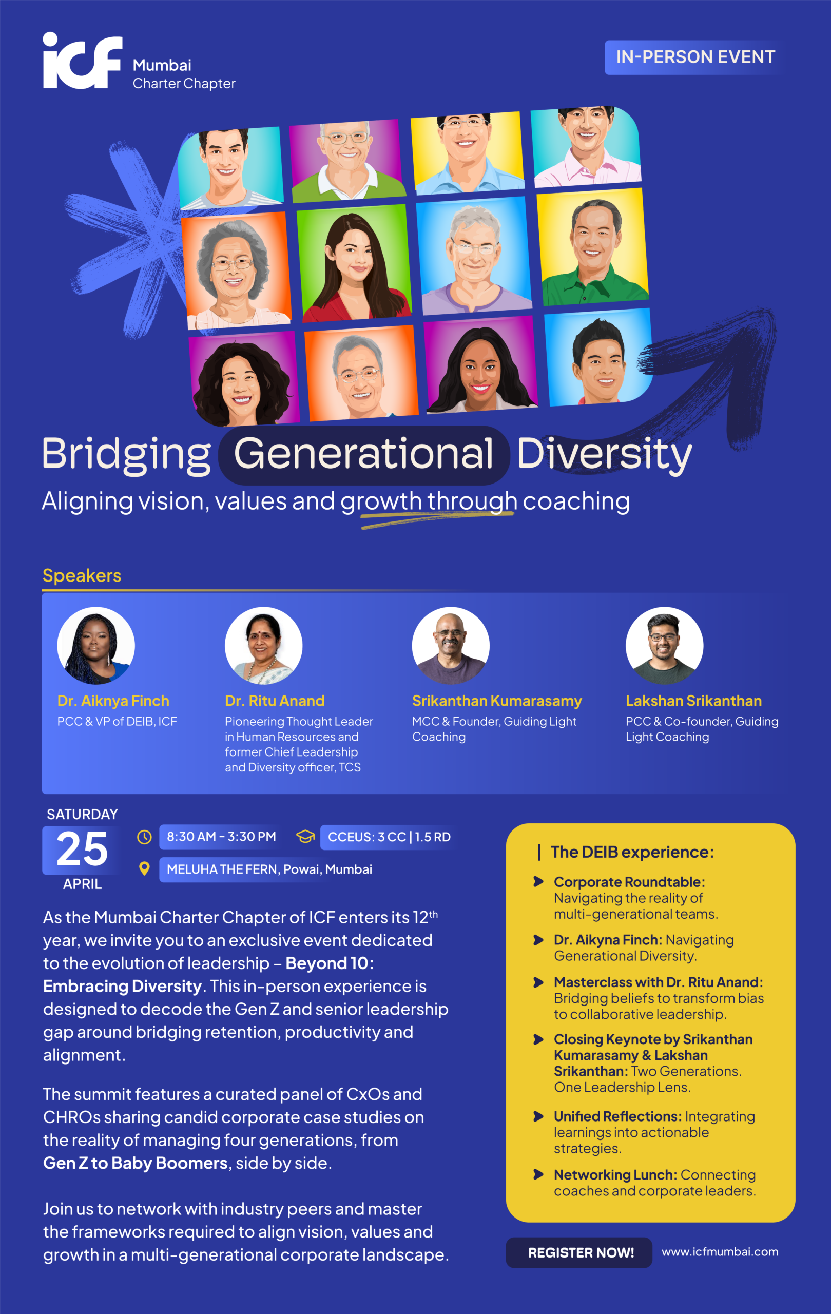 As modern workplaces evolve to include up to five generations working side by side, leading effectively has shifted from a cultural goal to a strategic business priority. The Mumbai Charter Chapter of ICF cordially invites professional coaches and corporate leaders to an exclusive, high-impact in-person DEIB event.